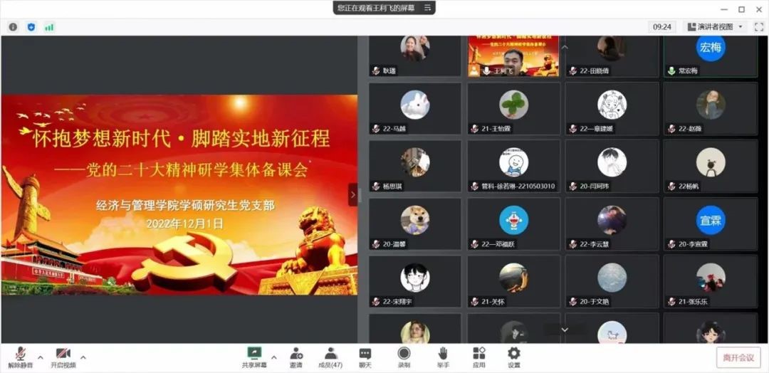为深入学习宣传贯彻落实党的二十大精神,用党的科学理论武装青年,用党的初心使命感召青年,牢牢把握团结奋斗的时代要求,凝聚同心共圆中国梦的强大合力。我院学硕研究生党支部于12月1日晚18:30以腾讯视频会议的形式召开“怀抱梦想新时代·脚踏实地新征程”—党的二十大精神研学集体备课暨寒假返乡实践部署会,马克思主义学院教师常宏梅、学硕研究生党支部成员40余人参加。