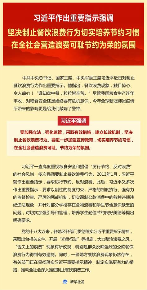 习近平强调,要加强立法,强化监管,采取有效措施,建立长效机制,坚决制止餐饮浪费行为。要进一步加强宣传教育,切实培养节约习惯,在全社会营造浪费可耻、节约为荣的氛围。