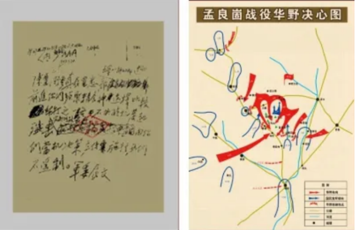 左图为中央军委1947年5月12日电示华野,不失时机发起歼击;右图为孟良崮战役华野决心图