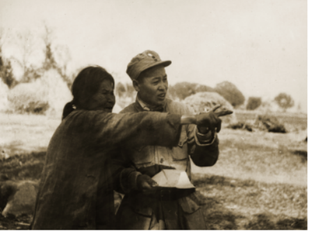 图为当地一位大娘冒着危险为我军炮兵指挥员指示炮击目标