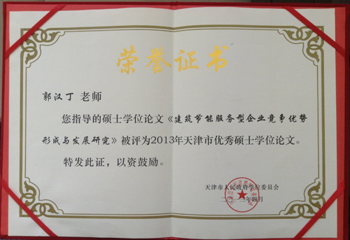 由郭汉丁教授指导,我院2008级硕士研究生葛继红完成的硕士学位论文《建筑节能服务型企业竞争优势形成与发展研究》,被天津市人民政府学位委员会评为2013年天津市优秀硕士学位论文。这是我校首次唯一获奖硕士学位论文,反映了我院研究生培养的水平和成绩,对进一步提高我院硕士研究生培养质量和学位论文水平将起到积极的促进作用。