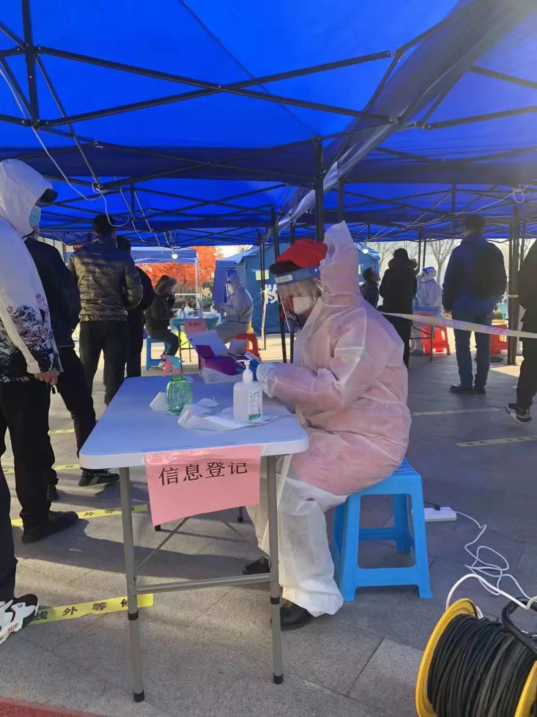 这是李老师第一次参与核酸筛查信息录入工作,她担心自己做不好影响核酸检测进度,加上一直有排队等待信息录入的群众,天很冷,可是李老师却着急得出了很多汗,一次性操作手套里面的手也是汗津津的。她一直提醒自己,要细心,要稳住。李老师说,“这次志愿服务,让我感受到在我们党的领导下,大家是多么地团结一心。医务人员、社区工作者和志愿者在寒风中一直坚持工作,没有一个人喊苦喊累。排队的群众也都遵从现场工作人员的指挥,秩序井然。疫情防控工作体现了我们党的担当作为,也体现了我们普通群众对于党的工作的支持。我相信,在党的领导下,我们众志成城,一定能够赢得抗击疫情的胜利!”