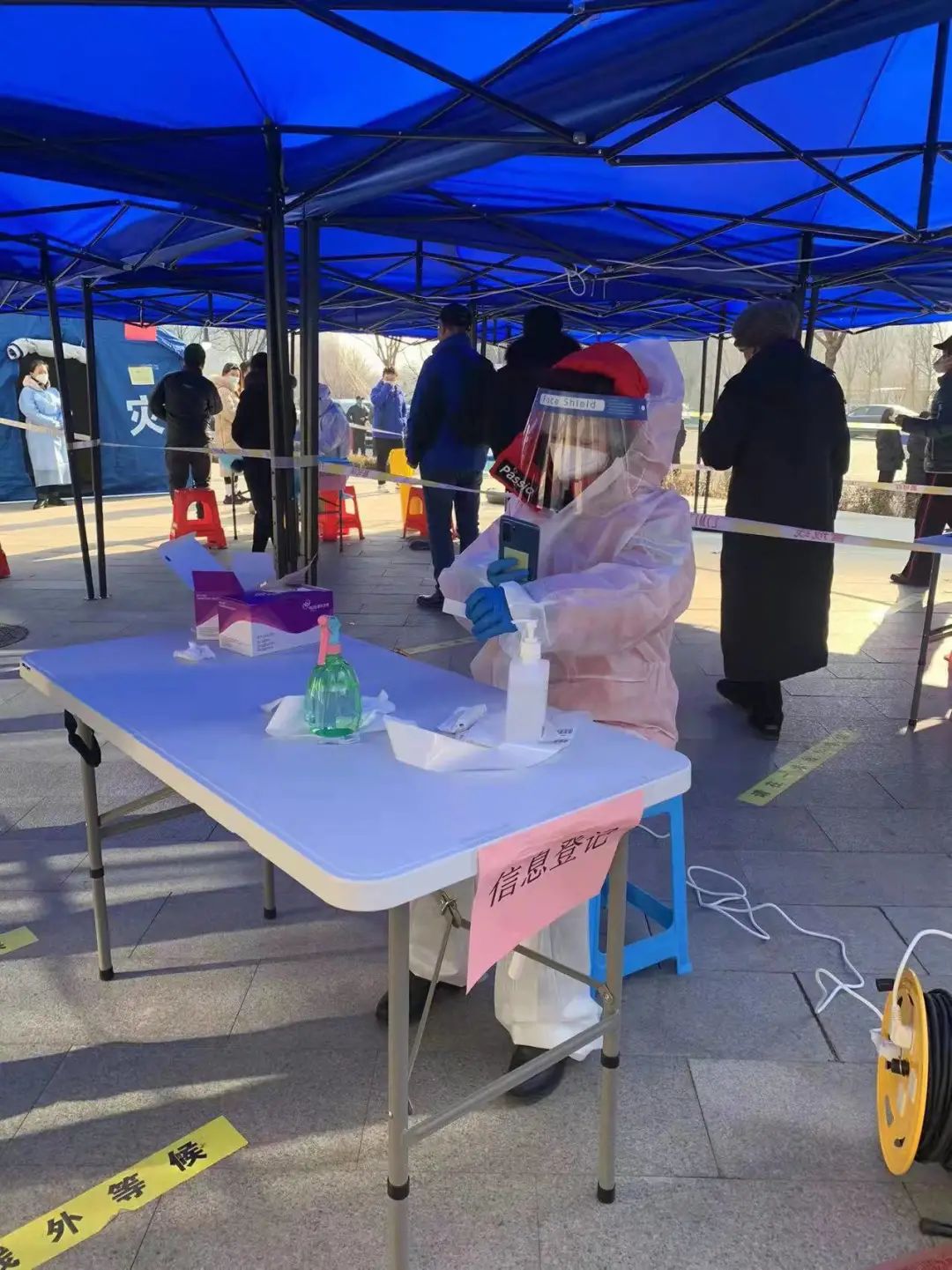 1月14日,李美岩老师接到了张家窝镇社会山社区安排的第三次核酸筛查工作任务:信息录入工作。1月15日天刚蒙蒙亮,李老师准时到达工作点位,在报道处领取袖标、口罩、暖贴、防护服等物资,提前熟悉信息录入系统操作方式。