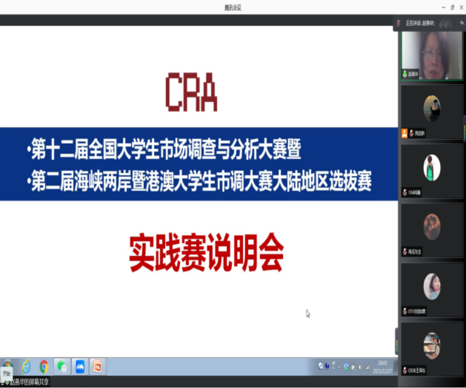 “正大杯”第十二届全国大学生市场调查与分析大赛组委会统一组织的网上个人知识赛已结束,我院有157名同学顺利通过,占总报名人数的95.2%。为更好地帮助选手准备后续进行的实践赛,云图调研社日前组织了实践赛说明与选题线上培训会。培训会采用腾讯会议形式,参加人员有云图调研社指导教师赵燕华老师、云图调研社前社长吴秋华、现主要负责人丁红霞、周远新、肖瀚等与参赛的同学们。